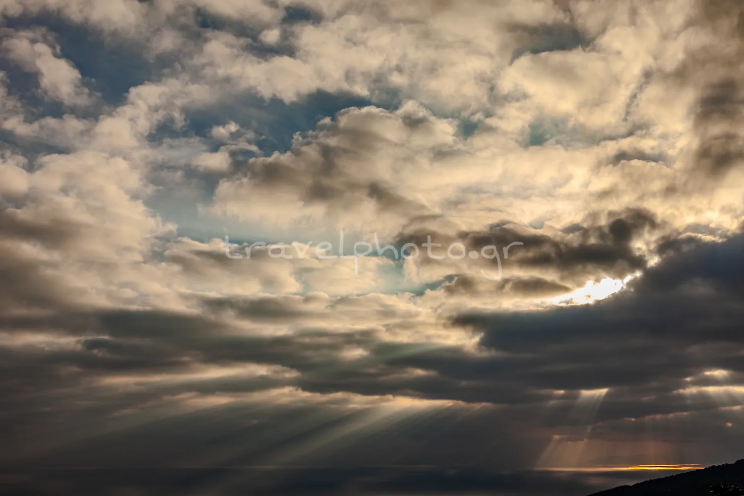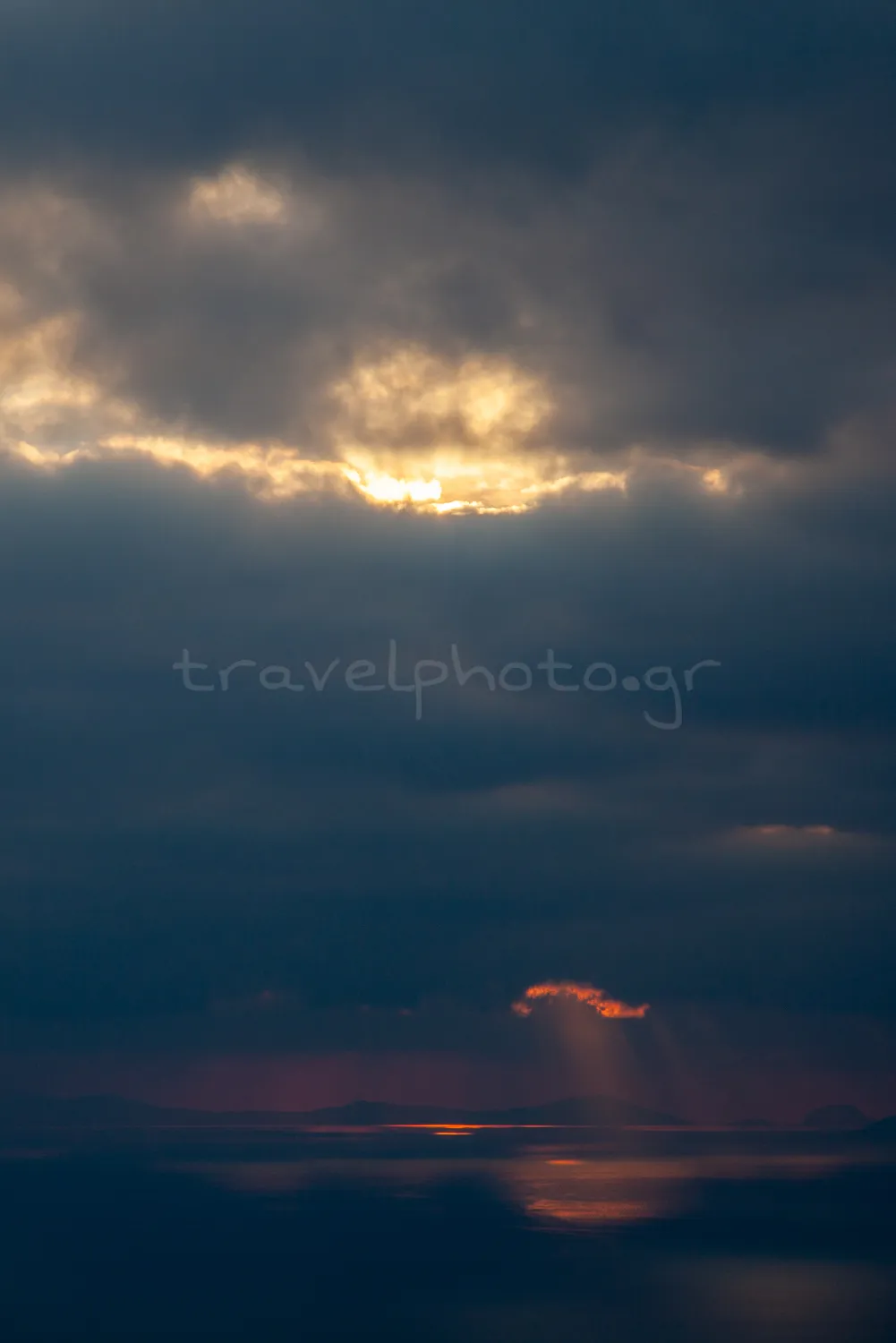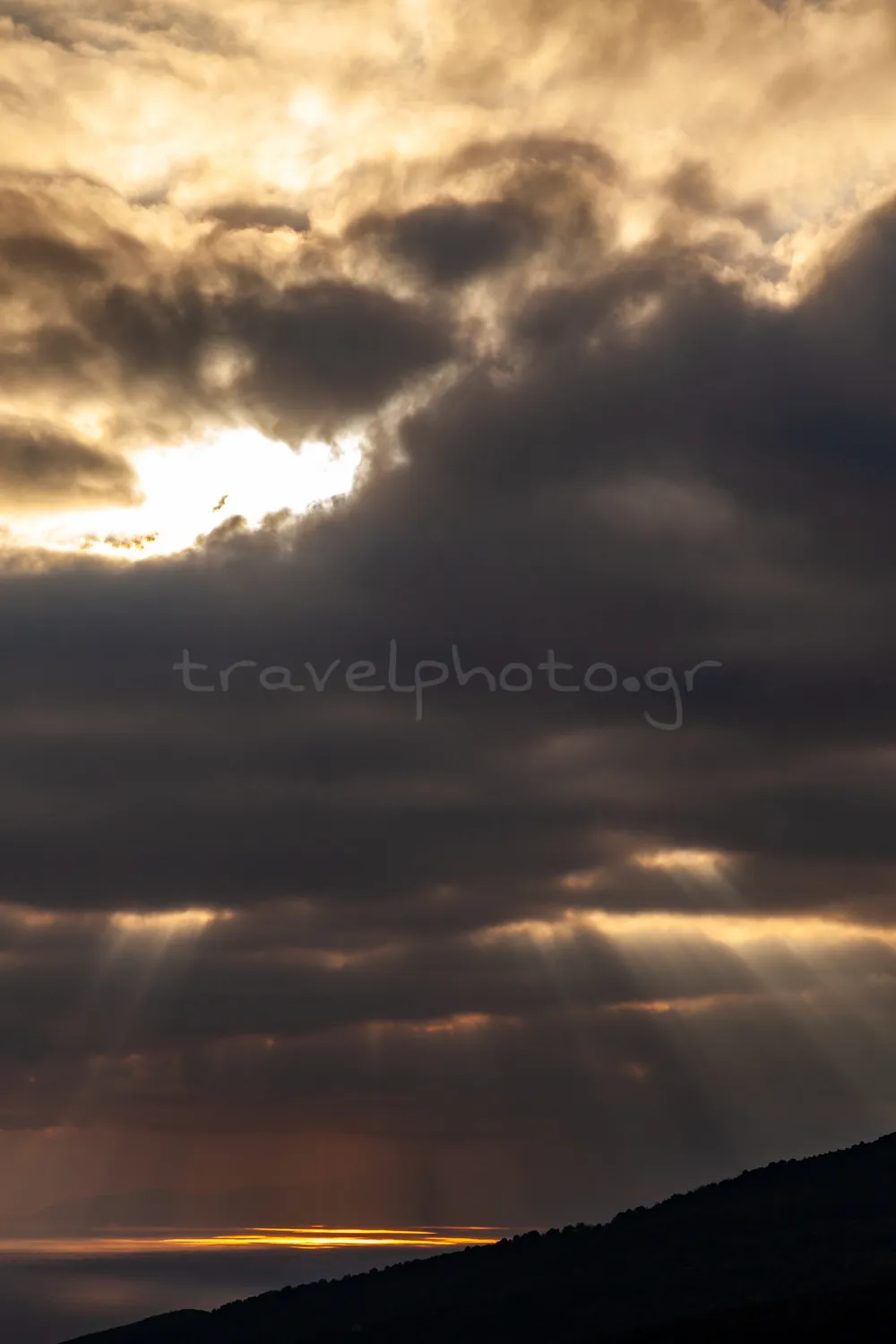 Σε κάποιες φωτογραφίες τα κενά στα σύννεφα ήταν πολλά αλλά μικρά βοηθώντας έτσι στη δημιουργία πέπλου ηλιαχτίδων ενώ άλλες στιγμές οι “τρύπες” ήταν λιγότερες αλλά μεγαλύτερες εστιάζοντας το πρωινό φως του ηλίου σε πολύ συγκεκριμένα σημεία πάνω στην “νυσταγμένη” ακόμα επιφάνεια της θάλασσας δίνοντας της ένα βαθύ πορτοκαλί και χρυσοκίτρινο χρώμα που με κράτησε για πάνω από ένα τέταρτο μαγεμένο από ένα ακόμα απρόσμενο δώρο του βουνού των κενταύρων.