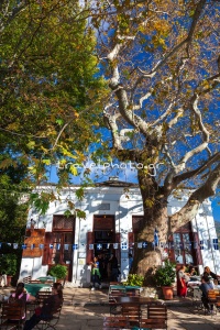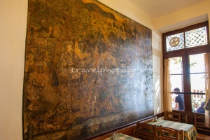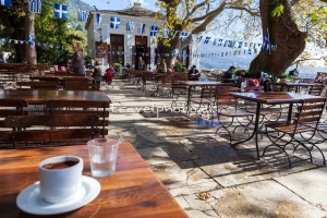 - Das Café Theophilos, wo Sie das große Wandgemälde des berühmten griechischen Malers Theophilos Hadjimichael aus dem Jahr 1910 mit dem Titel„Schlacht von Krya Vrysi“ sehen können. (siehe das Foto des Wandgemäldes von Theophilos in dem traditionellen Café auf dem Platz von Makrinitsa auf den Fotos unten).