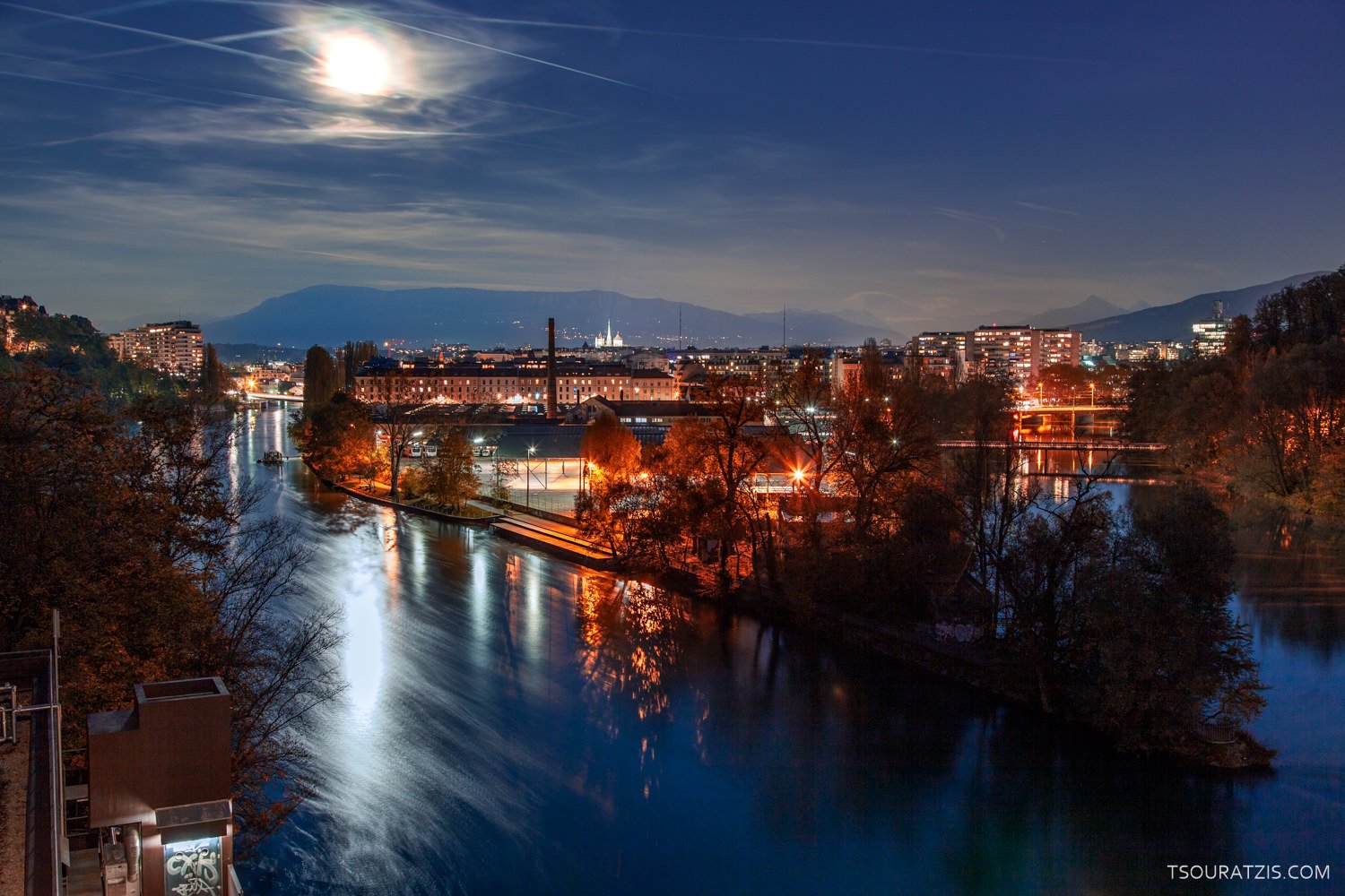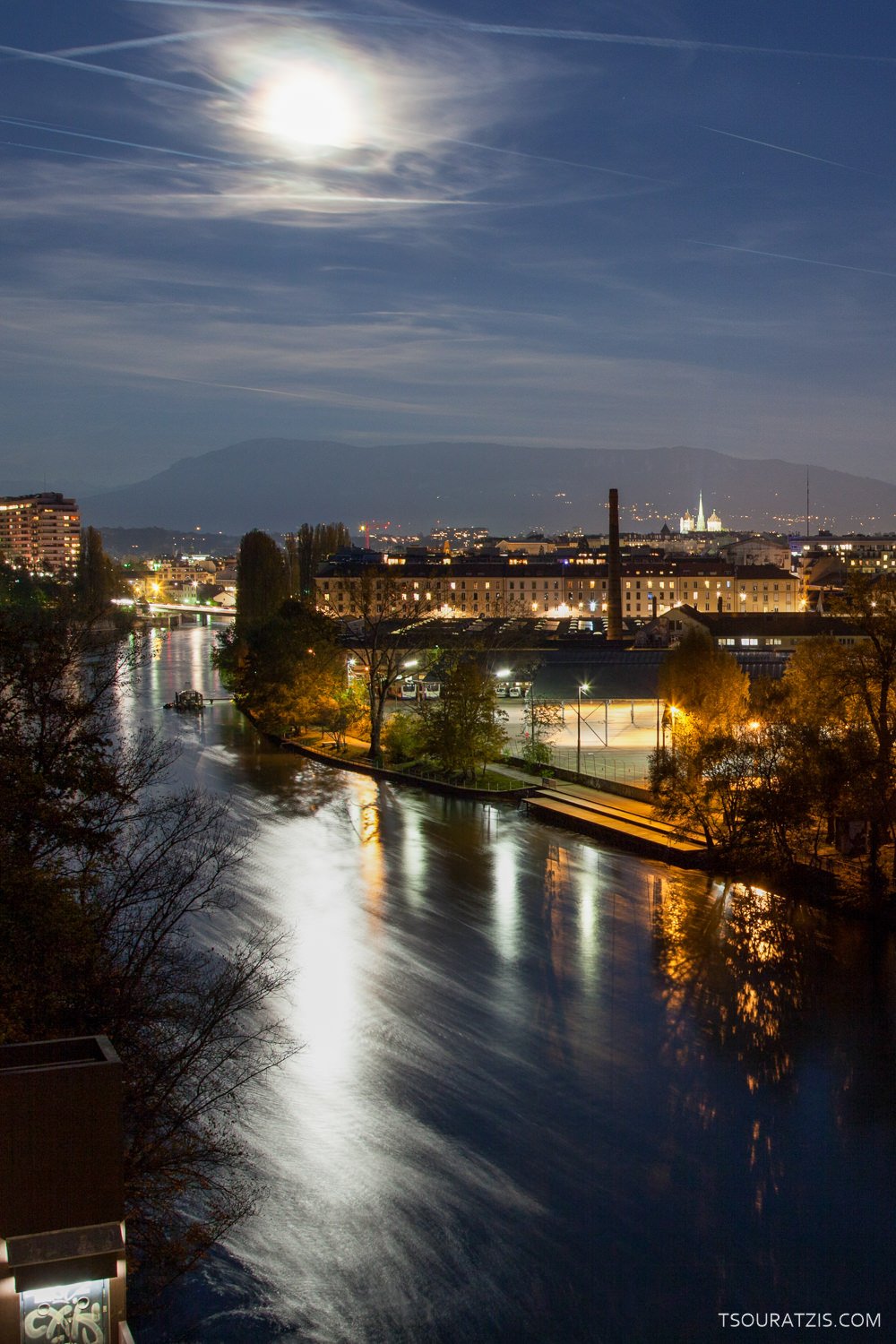 View images from Geneva during the full moon of October 2012 (Monday 29th). Most of the images are taken from the train and pedestrian bridge that offers a nice view to the junction of the two main rivers that pass through the city of Geneva (pointe de la Jonction in French: link to the Geneva city official website ), Rhone and Arve.