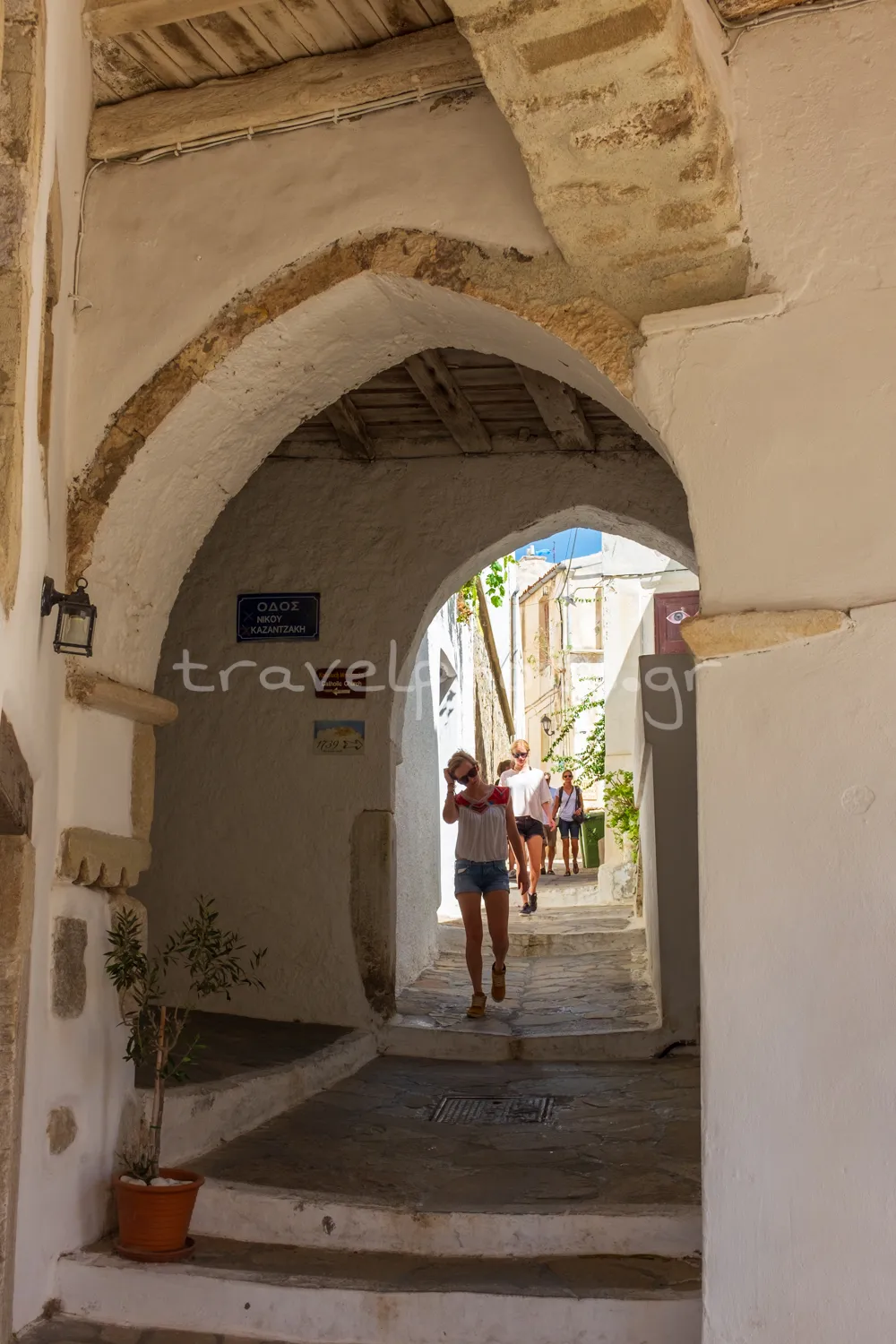 The tour of the island of Naxos starts from the beautiful town and its castle. Follow the narrow alleys from the coastal road and climb up to Bourgo, which means fortified settlement. Pass under arches with wooden buttresses from the Venetian era and see parts of ancient temples built into the old houses and 15th century coats of arms above the wooden doors.